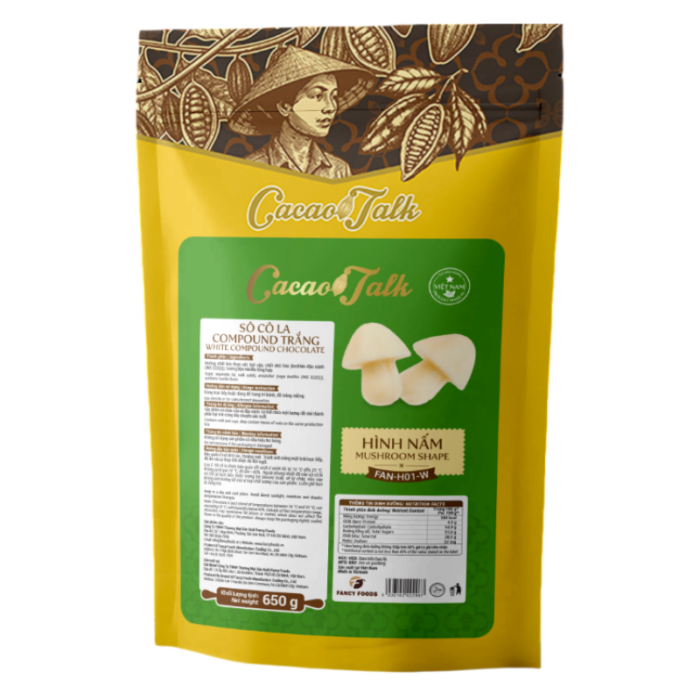 Sô Cô La Compound Trắng Hình Nấm FAN-H01-W Cacao Talk là sản phẩm của công ty TNHH Thương Mại Sản Xuất Fancy Foods. Một thương hiệu chuyên sản xuất các dòng sản phẩm từ sô cô la tại Việt Nam. Điểm nổi bật của các sản phẩm chính là, mang đến một trải nghiệm về hương vị sô cô la hảo hạng thông qua quy trình sản xuất, kiểm soát nghiêm ngặt, từ khâu nguyên liệu đầu vào đến thành phẩm đầu ra. Với các sản phẩm đặc biệt như: Sô Cô La Bọc Hạt, Sô Cô La Nút Nguyên Chất, Sô cô la compound,… Thích hợp dùng cho làm bánh, pha chế thức uống và trang trí.